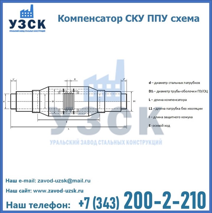 Уральский Завод Стальных Конструкций в Актобе предлагает готовые изделия, а также вы можете приобрести компенсатор СКУ ППУ под заказ. Наш завод располагает всем необходимым оборудованием для производства нестандартных позиций компенсатора СКУ в ППУ изоляции. Завод «УЗСК» предлагает большой выбор качественных и надежных компенсаторов СКУ ППУ, полностью укомплектованных и готовых к эксплуатации. Мы гарантируем соответствие нашей продукции всем требованиям ГОСТ и ТУ, износостойкость и высокую производительность. Наше предприятие поставляет и производит оборудование, имеющее длительную гарантию и большой эксплуатационный ресурс. Если вы хотите заказать сильфонные компенсационные устройства СКУ ППУ или другое оборудование с доставкой, наши специалисты помогут рассчитать стоимость транспортных расходов и организуют доставку товара. Вы можете оформить заказ на продукцию на нашем сайте, для этого достаточно заполнить форму обратной связи.