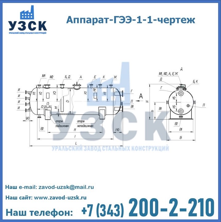 Стандартная емкость ГЭЭ оборудована люком для осмотра и внутреннего ремонта, и фланцами различного размера, для технологической обвязки, установки датчиков и приборов КИП и А.