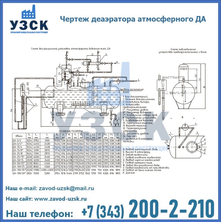 Приобрести качественное оборудование, в том числе, деаэраторы ДА, можно в компании УЗСК в Актобе. Мы предлагаем долговечную и надежную продукцию по приемлемой цене. Заказать и купить деаэраторы или другие изделия высокого качества можно через сайт Уральского Завода Стальных Конструкций, или позвонив по указанному в разделе «Контакты» телефону.